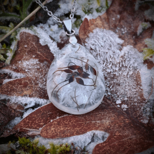 Des akènes de Clématite Vigne Blanche récoltées à la main au coeur de la nature, puis immortalisées dans un pendentif en résine.