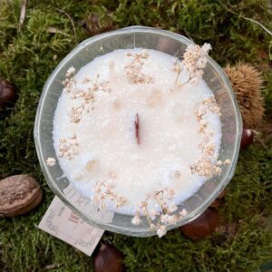 Une bougie au délicat parfum de Fleur de Coton et Gui, décorée de Gypsophile ainsi que de cristaux de roche et de paillettes biodégradables qui la recouvre tel un tapis de givre.