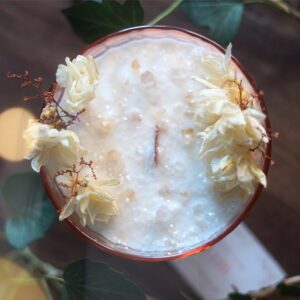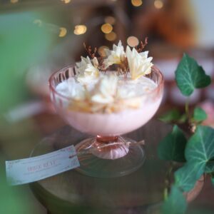 Apportez une touche d’élégance et de vintage à votre intérieur avec cette bougie artisanale unique au doux parfum de Freesia. Nichée dans une coupe sur pied rose pâle du célèbre modèle Rosaline des années 70 de la marque française Luminarc, elle est sublimée par des fleurs séchées, des cristaux et des paillettes biodégradables pour un effet magique et raffiné.