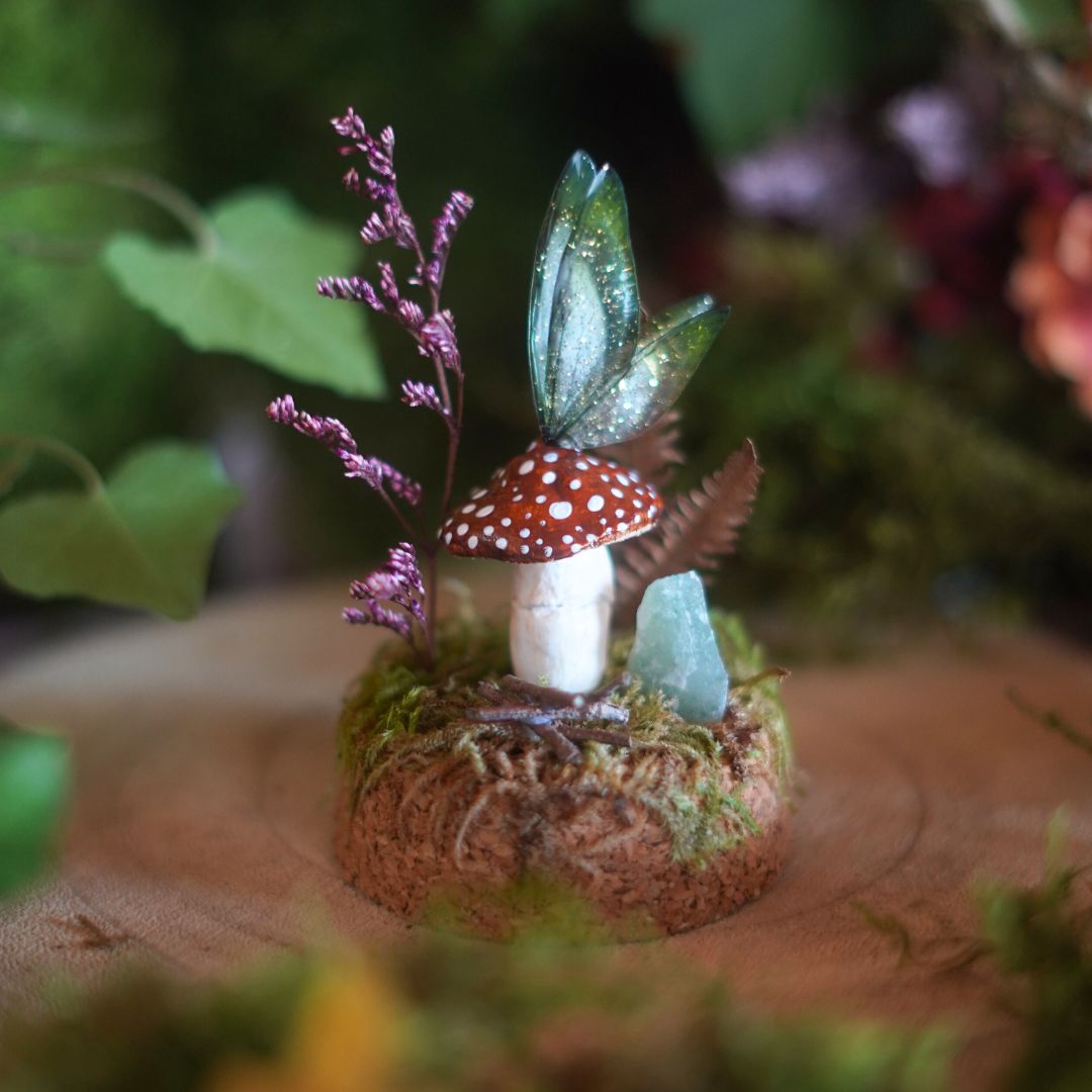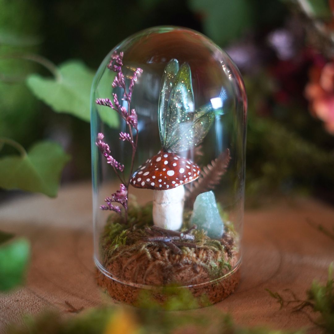Ce mini monde féerique aux couleurs d’automne, sous son dôme en verre, est composé de mousse, de fleurs séchées, d’un champignon en argile et d’ailes de fée en résine réalisés à la main. Une pierre de Calcite Verte, connue pour ses propriétés calmantes en lithothérapie, complète le décor pour une touche de douceur et d’énergie subtile.