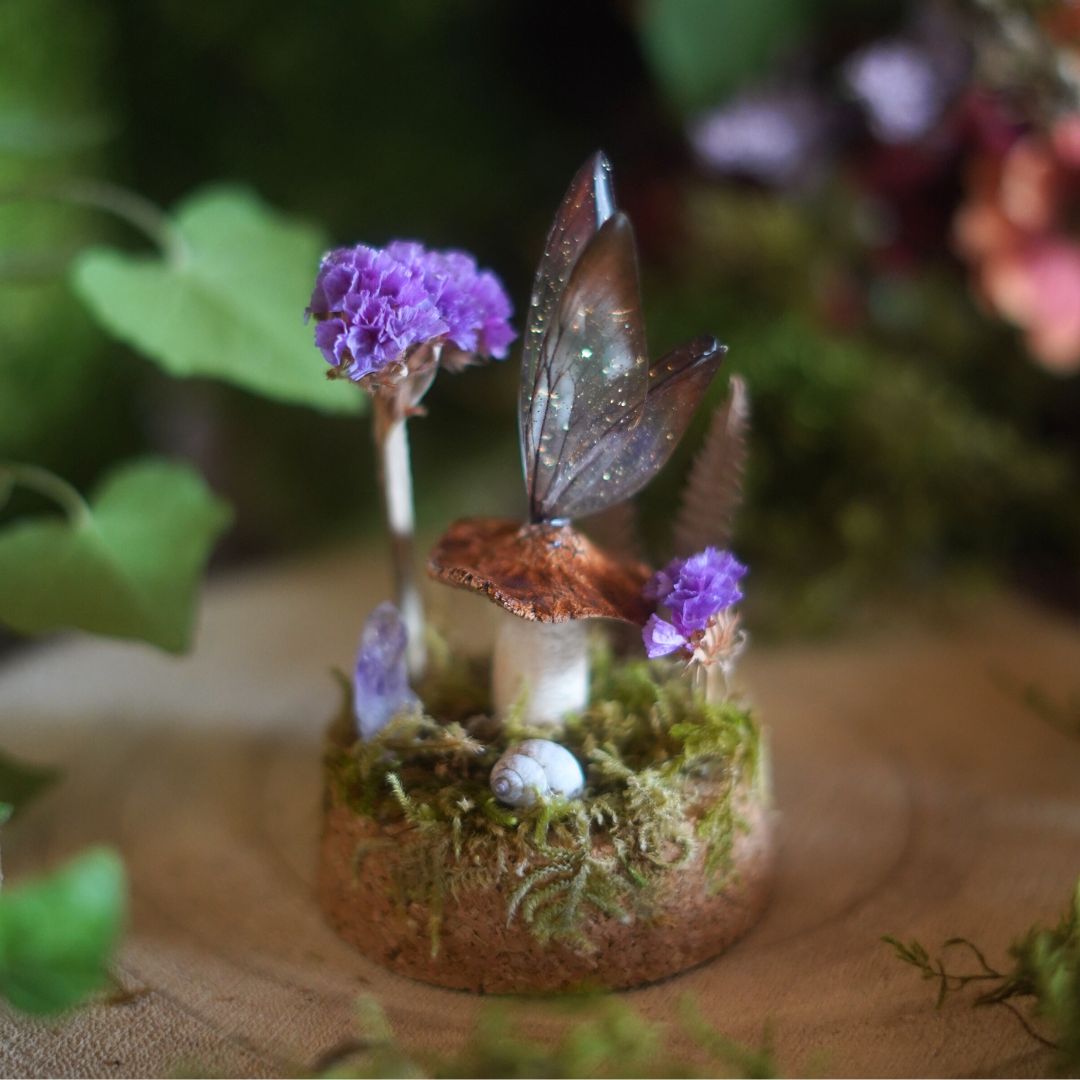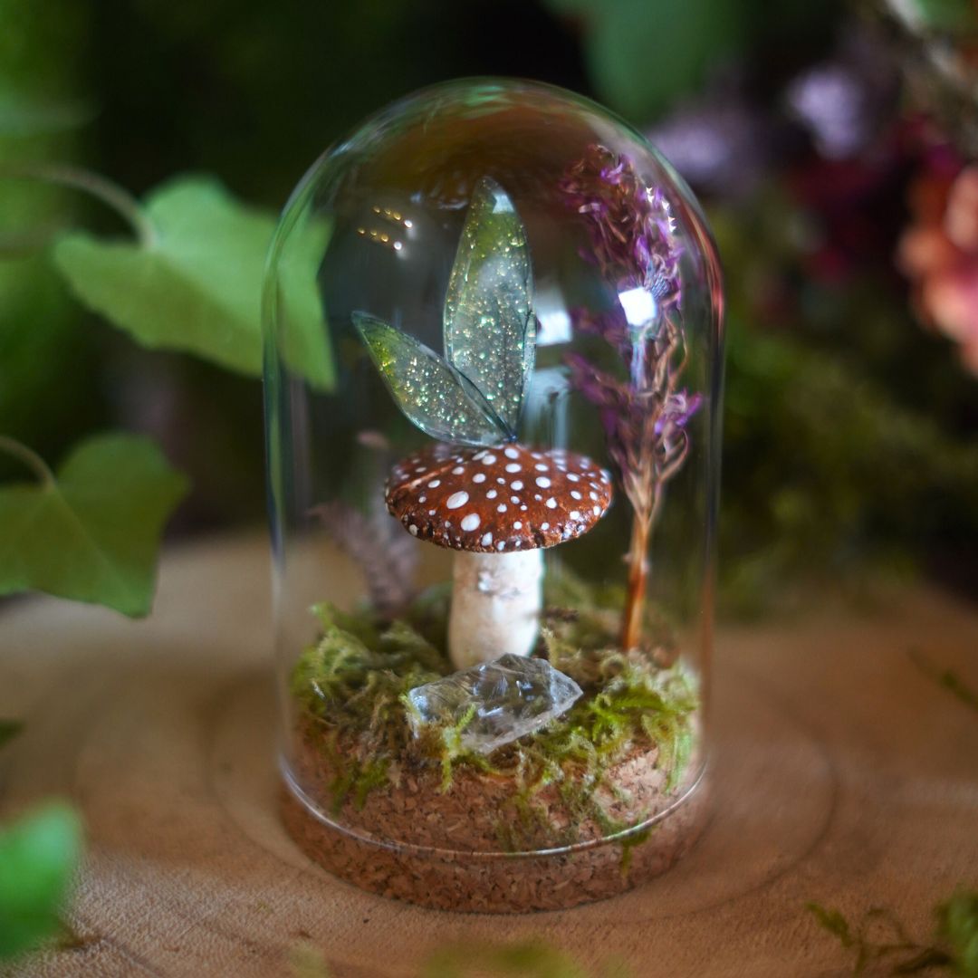 Ce mini monde féerique aux couleurs d’automne, sous son dôme en verre, est composé de mousse, de fleurs séchées, d’un champignon en argile et d’ailes de fée en résine réalisés à la main. Une pierre de Cristal de Roche, connue pour ses propriétés purificatrices en lithothérapie, complète le décor pour une touche de douceur et d’énergie subtile.