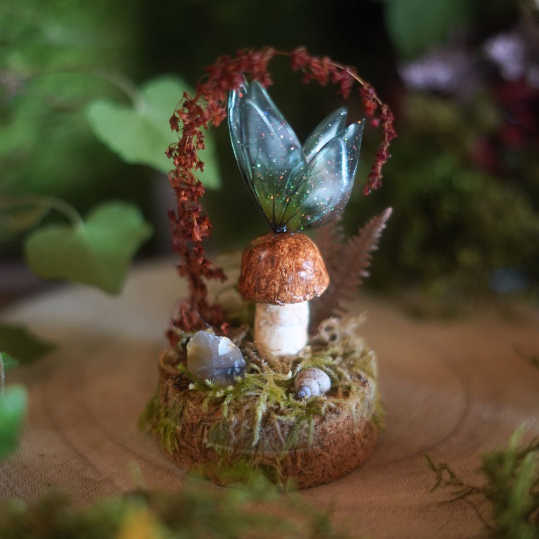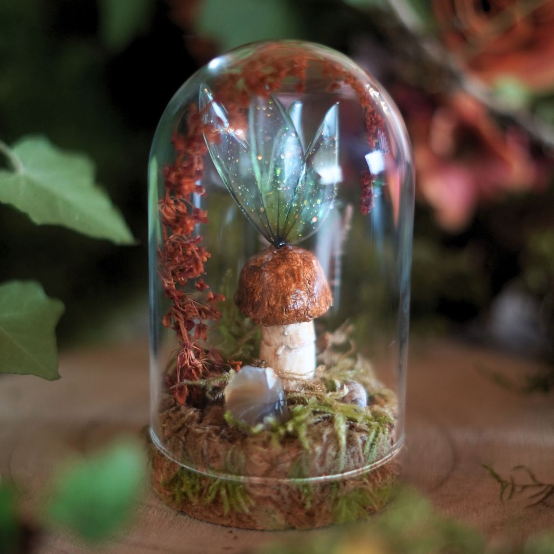 Ce mini monde féerique aux couleurs d’automne, sous son dôme en verre, est composé de mousse, de fleurs séchées, d’un champignon en argile et d’ailes de fée en résine réalisés à la main. Une pierre d’Agate, connue pour ses propriétés d’ancrage en lithothérapie, complète le décor pour une touche de douceur et d’énergie subtile.