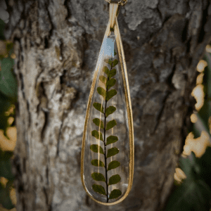 Une véritable feuille de fougère Asplenium Trichomanes, récoltée à la main au coeur des forêts du Périgord, immortalisée dans un pendentif en résine et laiton, au design élégant et minimaliste.