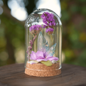 Des ailes de fée de couleur lilas et vert, confectionnées à la main à base de résine, d’encre et de paillettes, de fleurs séchées et en tissus. Le tout, protégé par un dôme en verre.