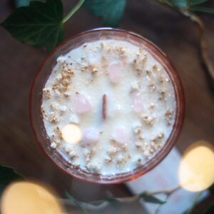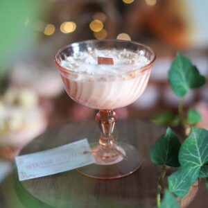 Apportez une touche d’élégance et de vintage à votre intérieur avec cette bougie artisanale unique au doux parfum de Muguet. Nichée dans une coupe sur pied rose pâle du célèbre modèle Rosaline des années 70 de la marque française Luminarc, elle est sublimée par des fleurs séchées, des cristaux de quartz rose et des paillettes biodégradables pour un effet magique et raffiné.
