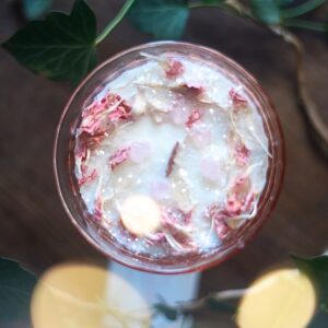 Apportez une touche d’élégance et de vintage à votre intérieur avec cette bougie artisanale unique au doux parfum d’Azalée. Nichée dans une coupe sur pied rose pâle du célèbre modèle Rosaline des années 70 de la marque française Luminarc, elle est sublimée par des fleurs séchées, des cristaux de quartz rose et des paillettes biodégradables pour un effet magique et raffiné.