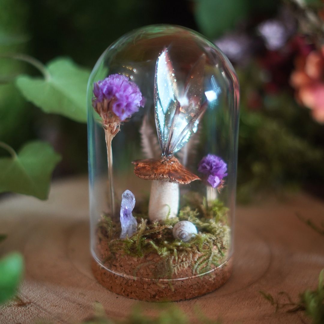 Ce mini monde féerique aux couleurs d’automne, sous son dôme en verre, est composé de mousse, de fleurs séchées, d’un champignon en argile et d’ailes de fée en résine réalisés à la main. Une pierre d’Améthyste, connue pour ses propriétés apaisantes en lithothérapie, complète le décor pour une touche de douceur et d’énergie subtile.